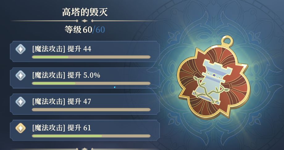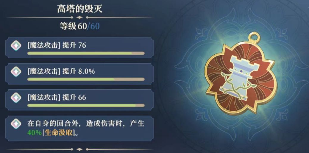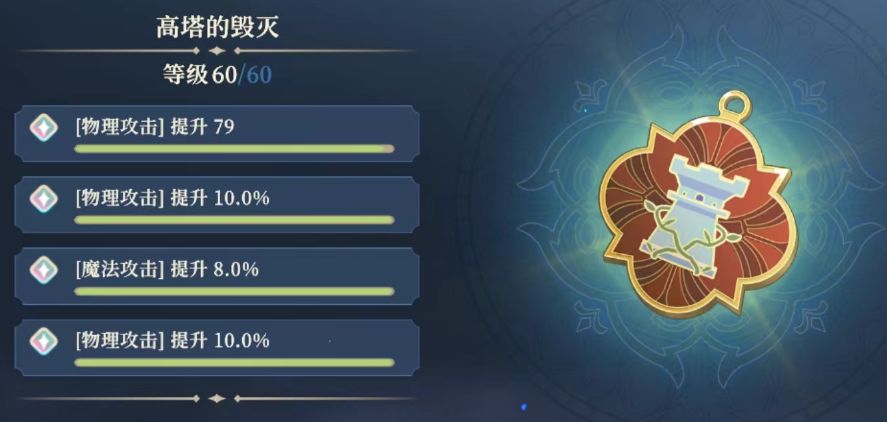 强化建议:强化词条以攻击属性最为优先,其次是生命。前三个词条中如出现单攻8%及以上,或固定值双攻120点及以上,则建议继续强化至50级看是否有特殊词条。此外,由于高塔的毁灭属于少数不需要特殊词条的塔罗,因此也可以考虑追求全攻击词条。从概率上说,达到同类型双攻+特殊词条,或同类型三攻词条,即为“小毕业”。