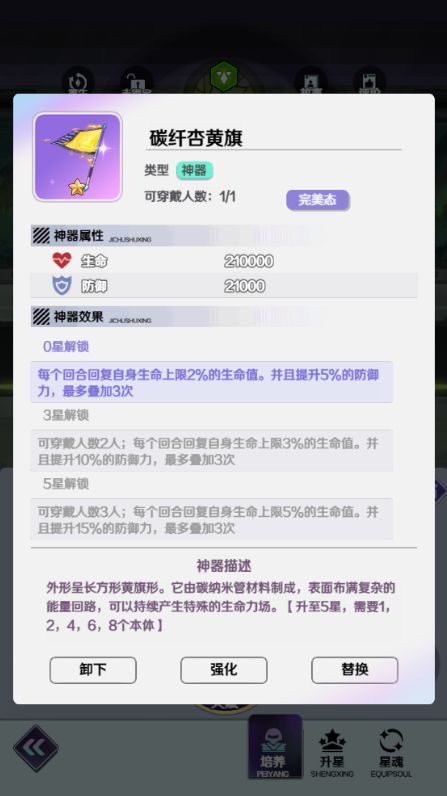 重复获得的神器将会转化为100个同名神器碎片,神器可以消耗同名碎片强化升星,神器在升至高星后,神器的效果将获得巨大提升,大部分神器还可以让多个英雄共同装备使用,将神器的效果发挥到极致。