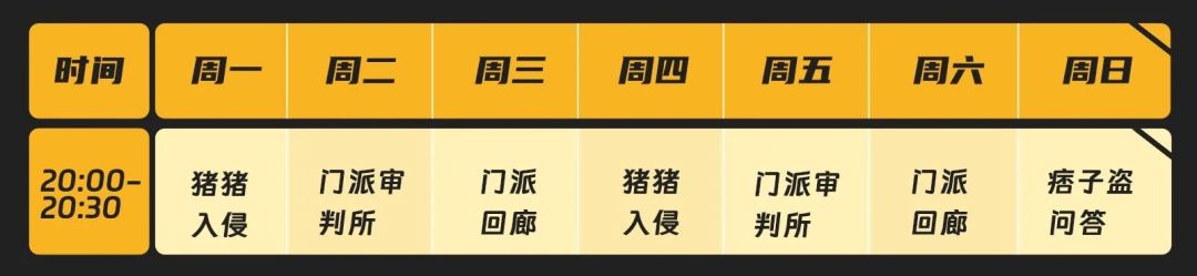最后让兰兰为大家整理一下门派活动时间,每天固定20:00~20:30的时段,但每天精彩不同,方便灵芝们可提前掌握和熟悉。关于参与地点,非常抱歉,目前活动只能通过门派庄园的装置进入,暂无弹窗提示和其他指引,后续研发将会进行优化,敬请期待哦。