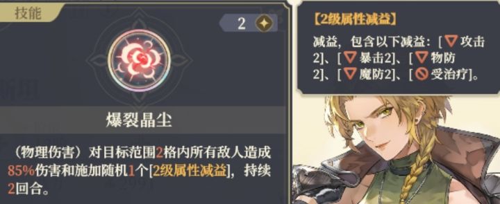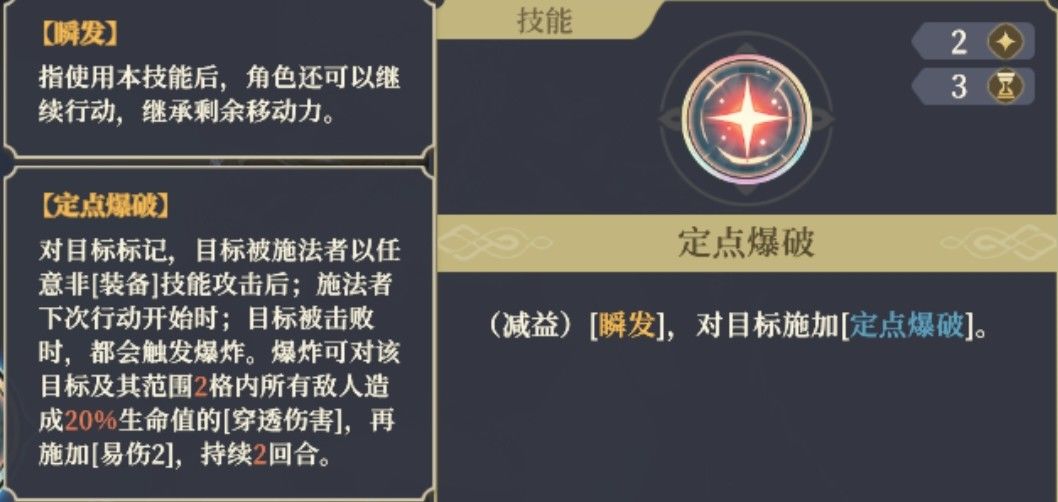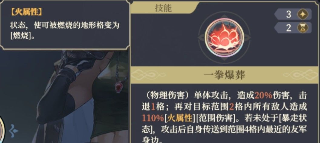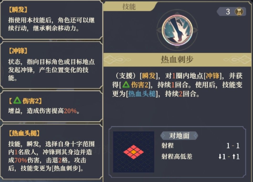 ,相当于小姐头的普攻的第二个形态,同样是冲锋距离3格,击退2格,由于要有能攻击的目标,所以要把控剩余的移动力,避免近身技能打不到人(我一开始用好多次都是这样,只能回溯