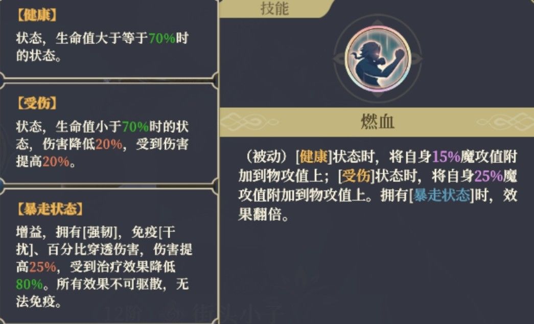 ),能量还给你拉满,进入赛亚人状态伤害提高,但上了一个减治疗的debuff是不可驱散的,所以翠姐的不屈结束后,血量是很难提上来的,就变的非常被动。 热血刺步:双瞬发技能,对于翠姐来说有着非凡的意义,推荐在自身移动前用,能在使用攻击技能之前给自己上一个增伤buff,用完直接转换成第二种形态,也是瞬发