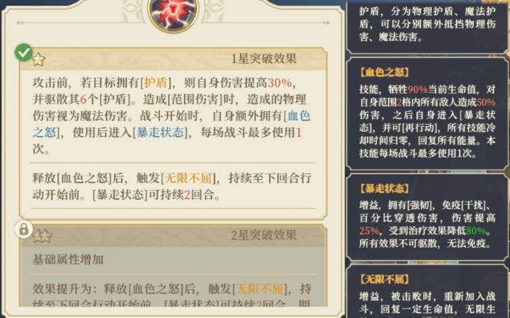 。 血色之怒是翠姐专属的瞬发技能,每一场战斗只能用一次,翠姐的再行动还是有点卡手的并非传统的再动机制,简单点说“其他的再动效果是算第二个回合,而翠姐的再动还是当前的回合”,那就意味着翠姐用的不是瞬发技能,那就接不上血色之怒,就无法再动,直到下个自己的回合才能行动。