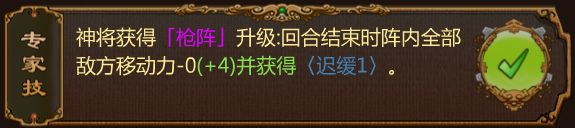 「枪阵」:(1)可指定1方向,该方向3*4格内敌人(非建筑)打出【任意攻】或回合结束时,你可对其攻击(无视距离),若该攻击造成伤害则取消其攻击并击退1格(2)回合结束获得4张【攻】(攻击伤害+750),下回合开始时弃掉这些【攻】。