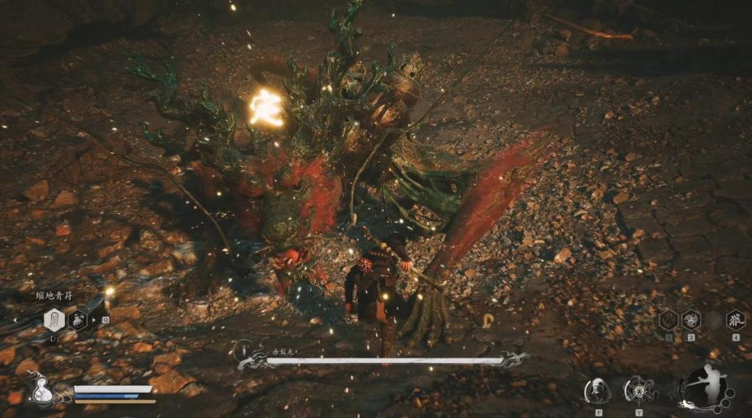 龙鳞的拿法就是在第二章中打完巨的老鼠BOSS之后,用蓝色大头变身对着场景中的满是佛像的墙砸一下,会砸出一个洞,进入洞中就可以拿到龙鳞了,然后回到第一章黑风山的瀑布前就可以开启隐藏地图,赤髯龙的难度倒是不高,回来打他的时候基本上玩家身上的装备和属性都比较强了。