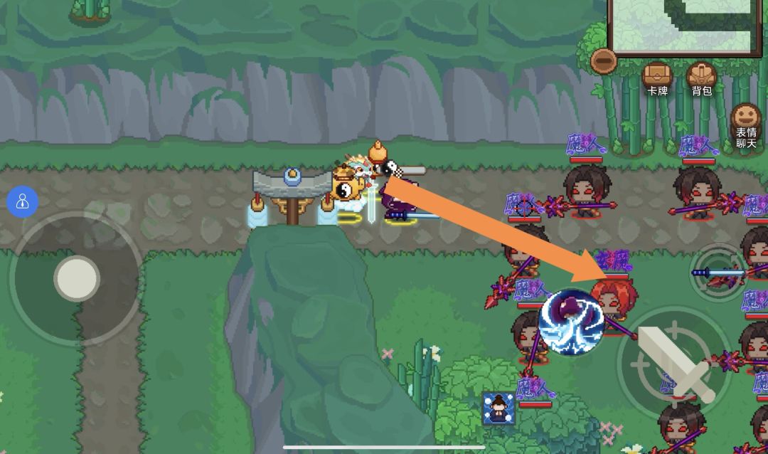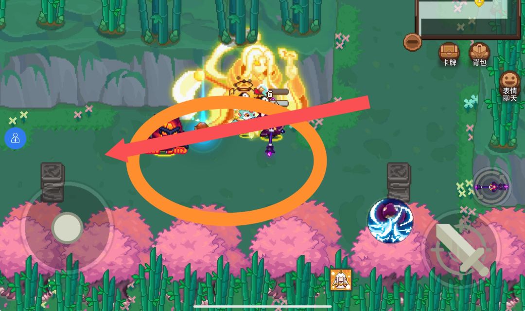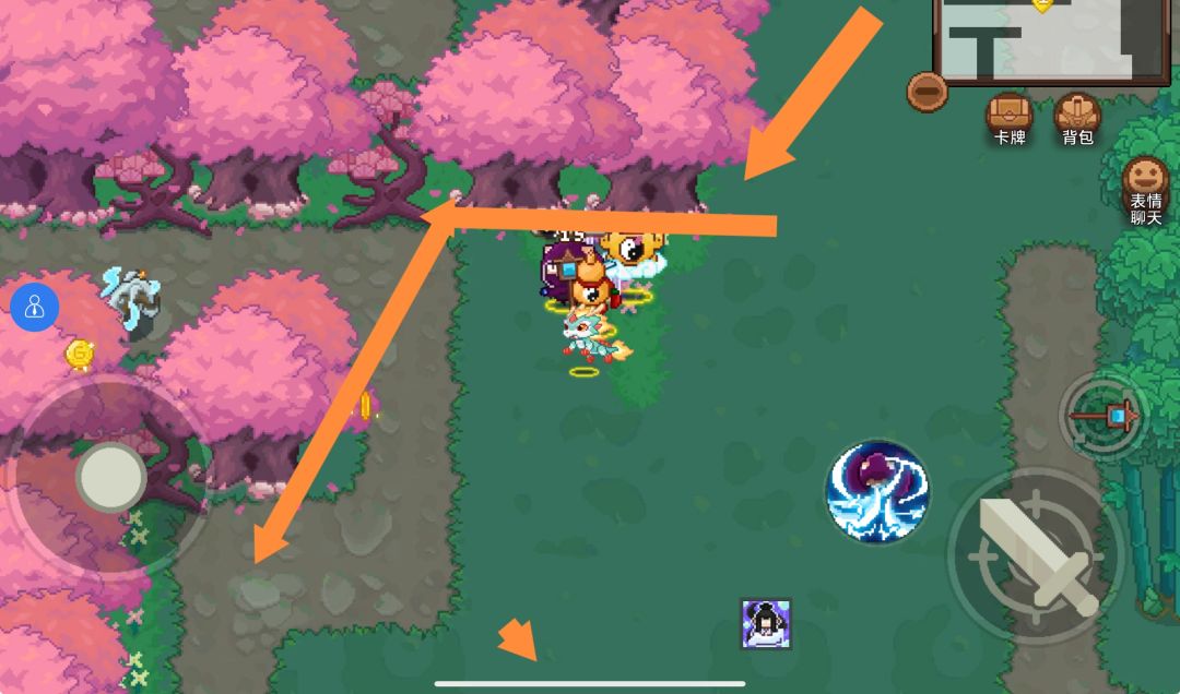 如果用杜内,在开打之前蓄力,人物向后退到大概橙色圆圈位置朝着橙色箭头方向释放,可以打到大部分怪