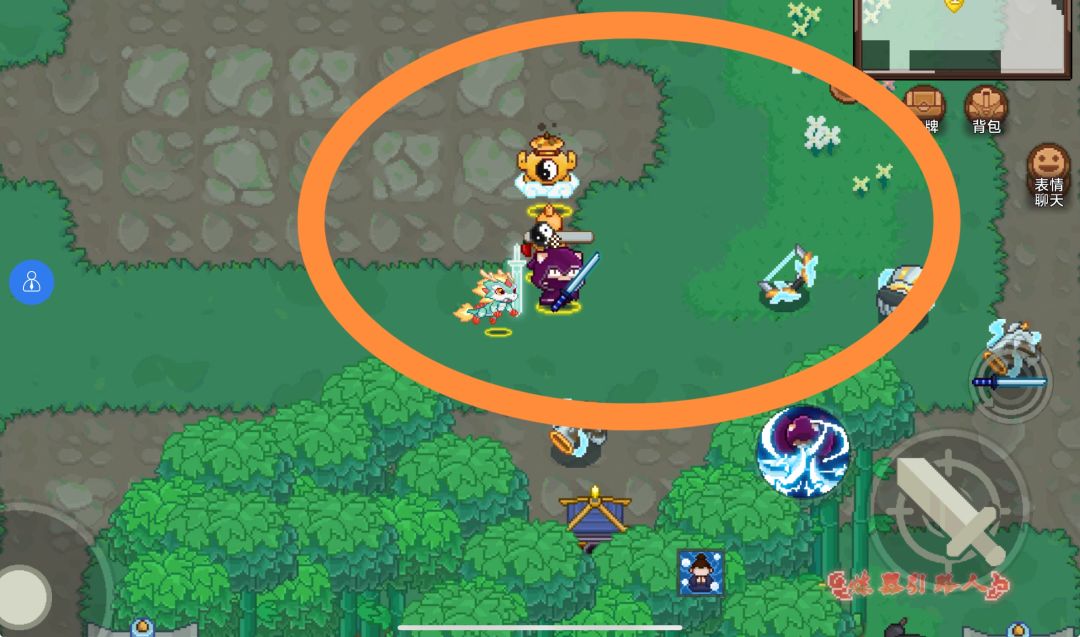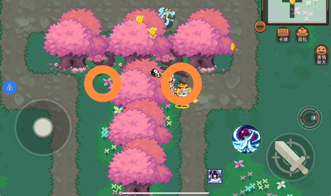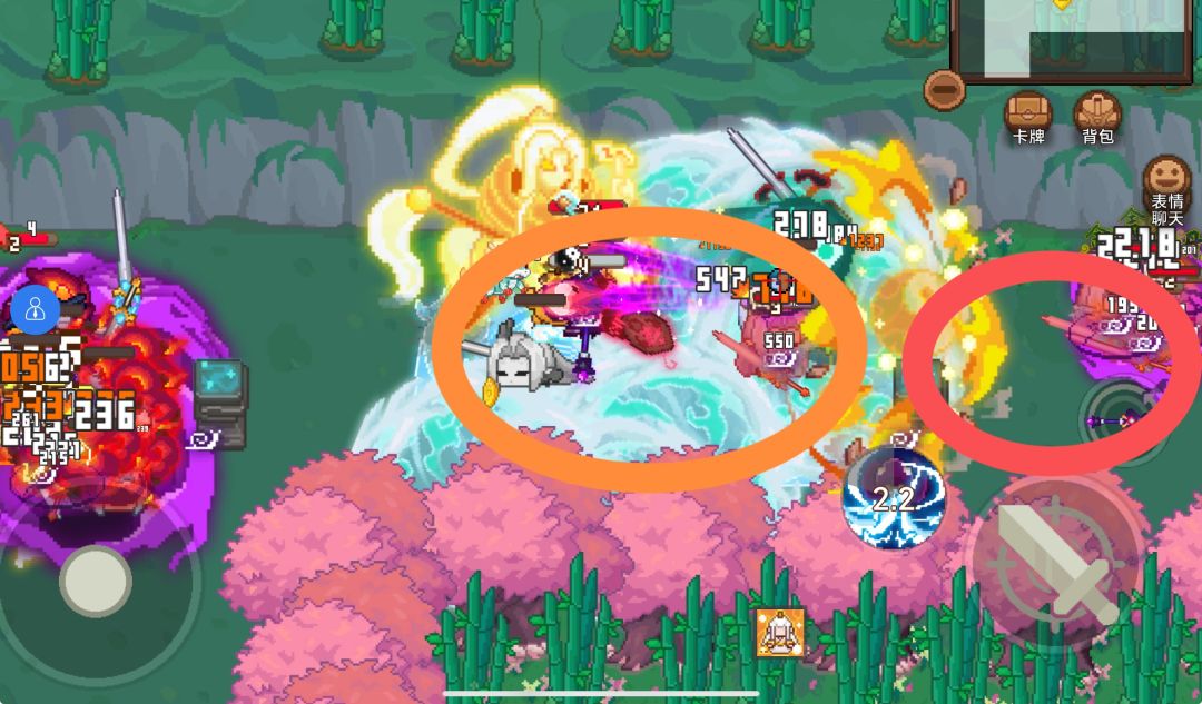 ①主C直奔中央,在如图(二图区域二-主C刷怪位置)所示的橙色圆圈区域输出。这里注意靠近左边竹林的怪有点远,要时不时的拉一下,或者让另一个混子去拉。