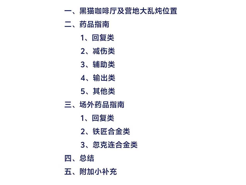 5、各职业人员按照自身需求特点,配置好所需物品,回复类药物建议每样配置50个以上,辅助类、合金类、增减伤类配置20个以上,其他类按需求配置5个以上。