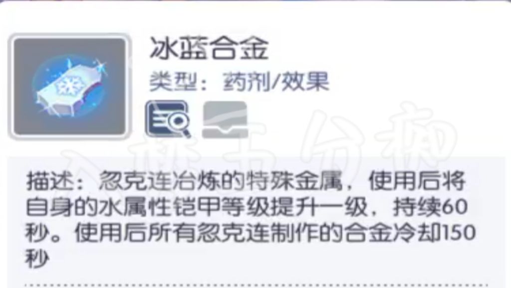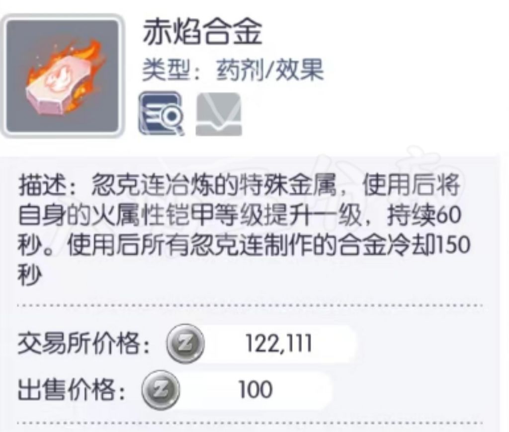 ① 4属性合金:使用后改变自身铠甲属性或提升自身属性等级60秒(如无属性变火1属性,火1变火2属性,火2比火1受对应属性伤害减伤及克制加伤会更高),所有忽克连合金CD共通150秒;如自身铠甲火属性,使用其他属性合金后则会覆盖原有属性
