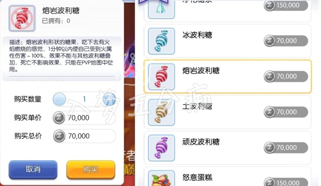③ 4属性波利糖(水风火地)1分钟内受到对应的属性伤害可减少100%伤害(真伤除外),CD5分钟,4属性波利糖属于共用CD,不与铁匠的免疫合金共CD,贴合自身情况进行使用;