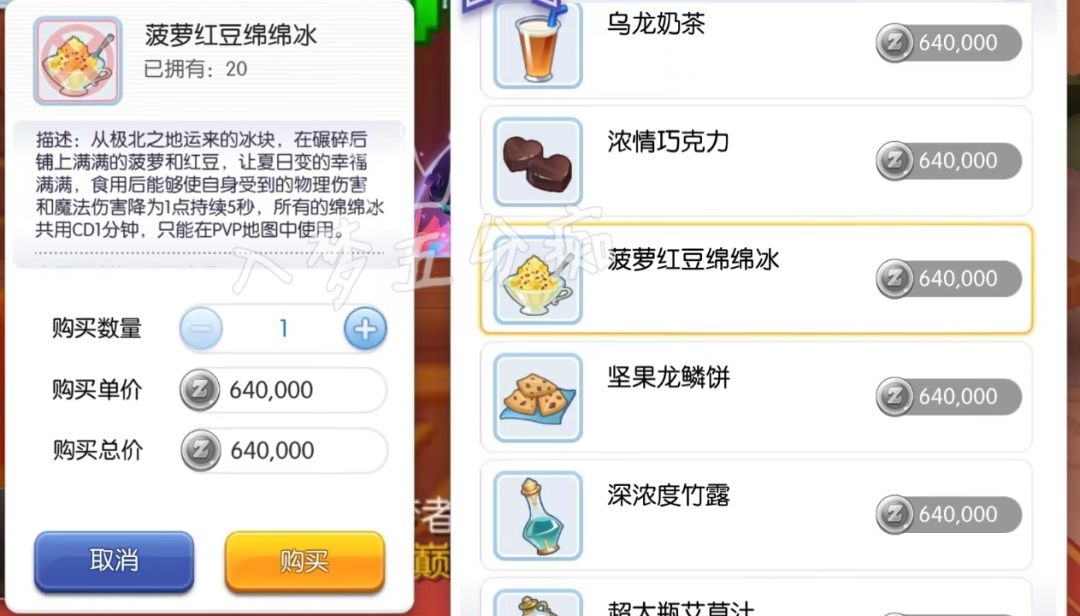 ② 菠萝红豆绵绵冰5秒内所有受到伤害强制为1,CD1分钟(与其他绵绵冰不能共用)