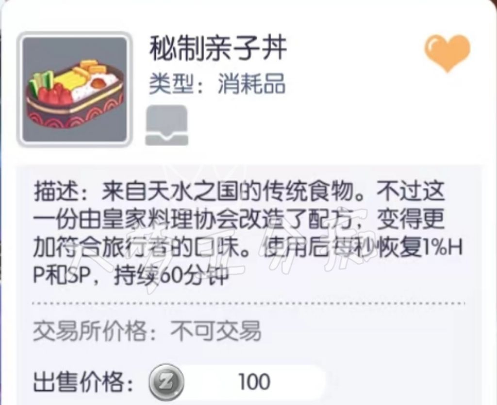 ① 秘制亲子丼:每秒回复1%HPSP,GVG内也是按照4倍回复(与全能波利棒棒糖的回复效果冲突)