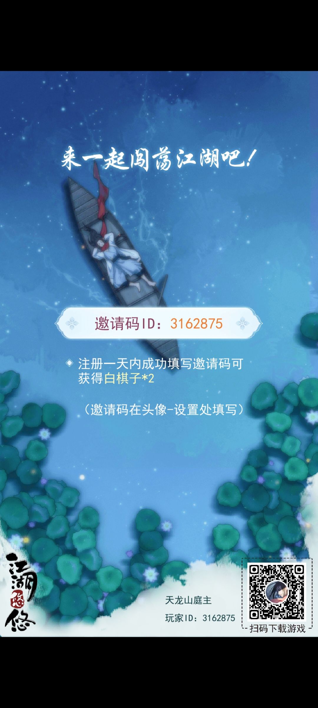 1、关注江湖悠悠的微信公众号,输入暗号:难道会有人不喜欢小鸭子吗?可以获得一本随机上品武学 邀请码 3162875领白棋子