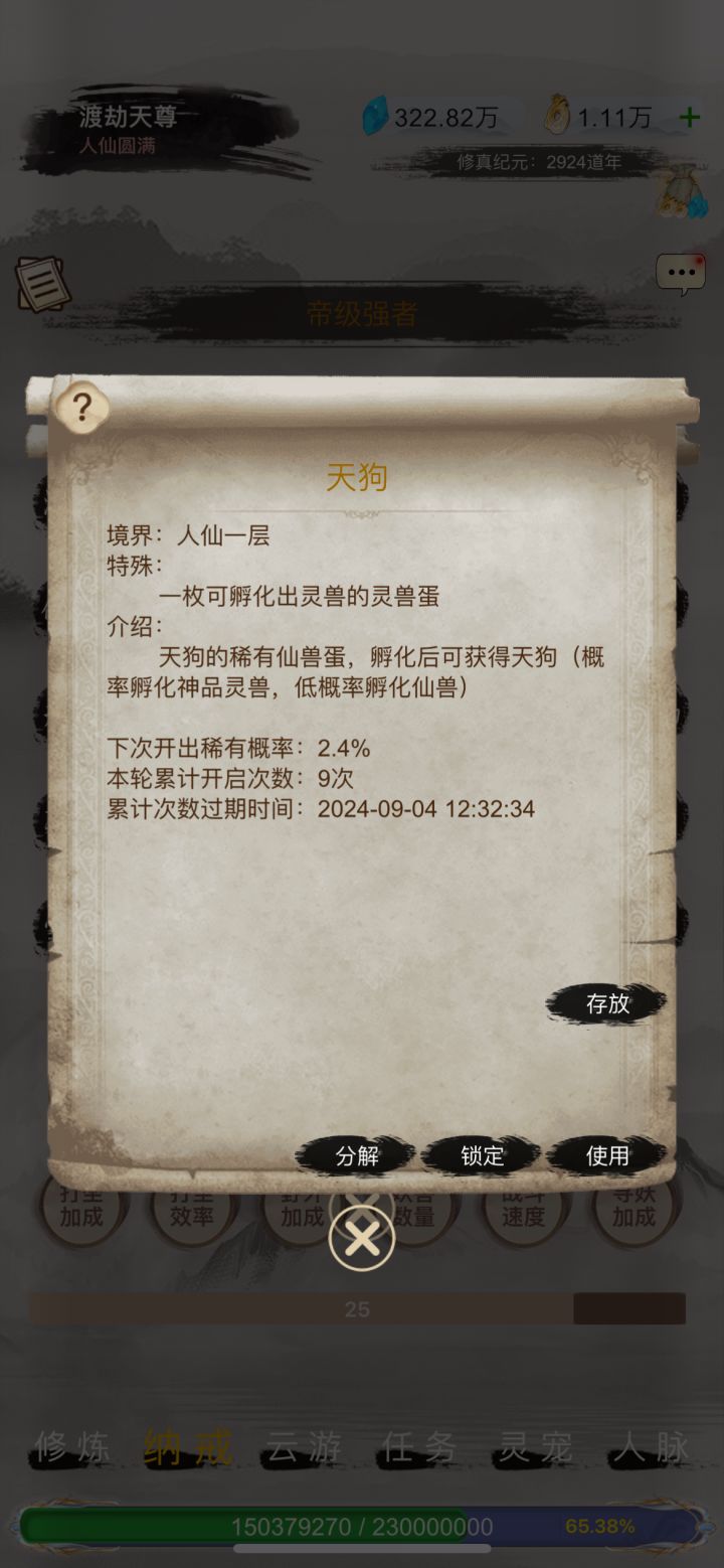 分解法器会获得法宝积分,纳戒界面右上角兑换查询.