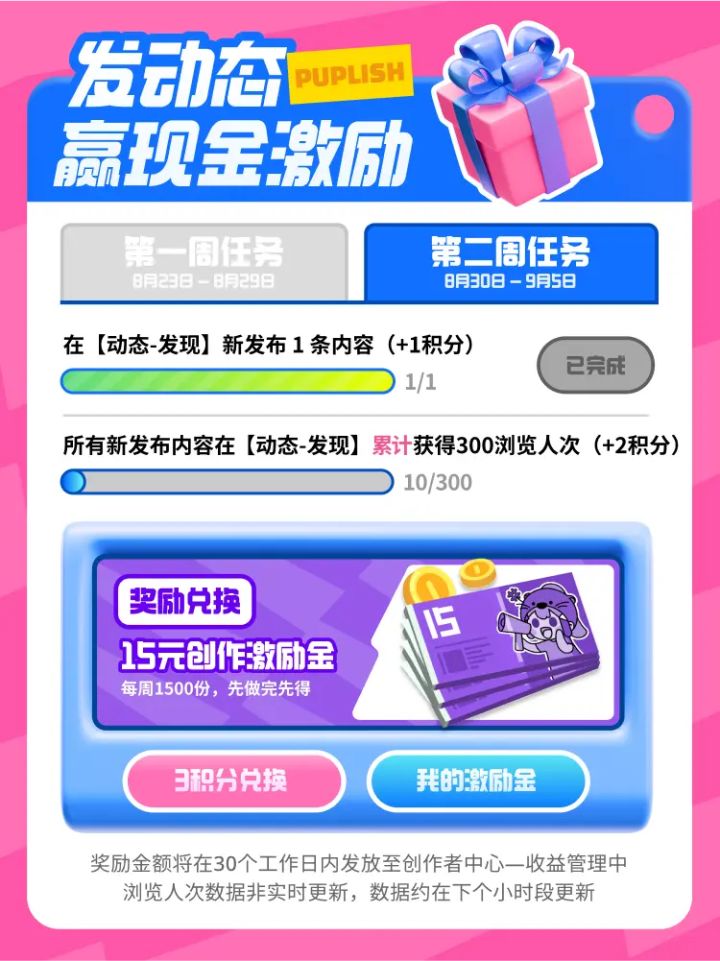 8月30日-9月5日,在【动态-发现页】完成发布任务,即可领15元创作激励金~