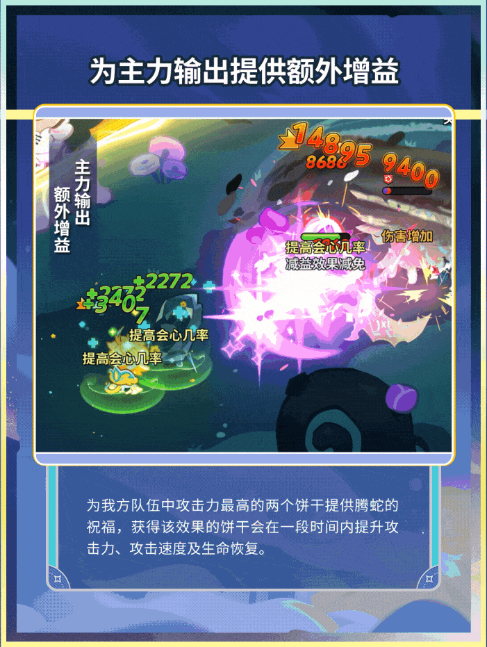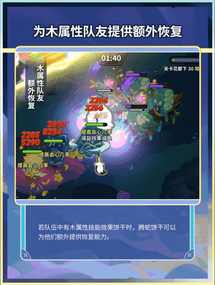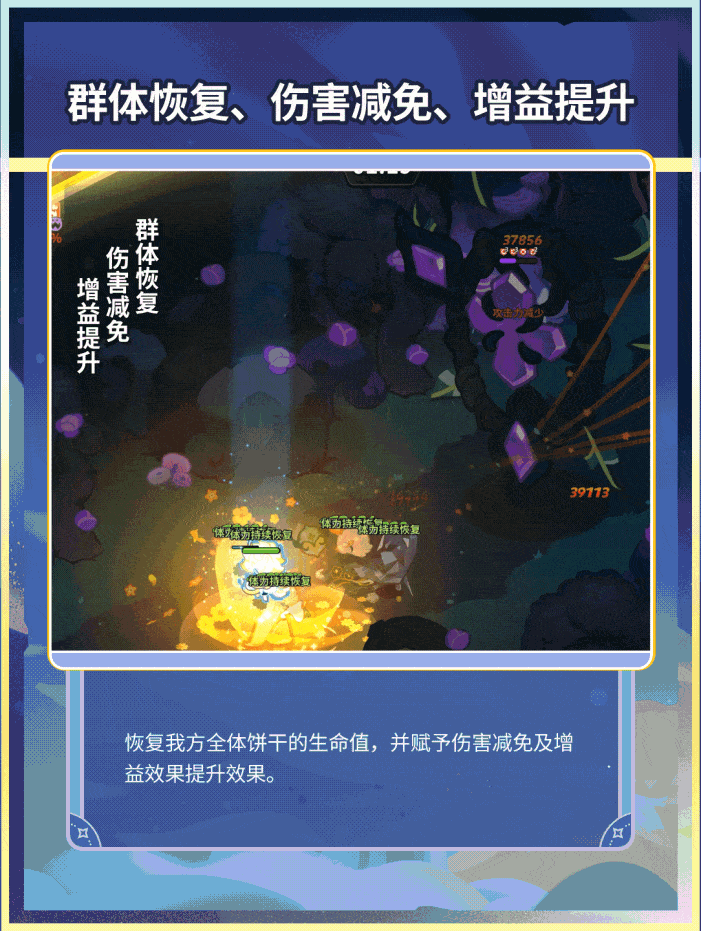 恢复型饼干,对我方全体治疗/增益。对主力输出提升攻击、攻速等增益效果。对木属性队友恢复额外生命值。