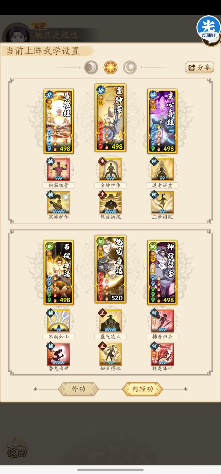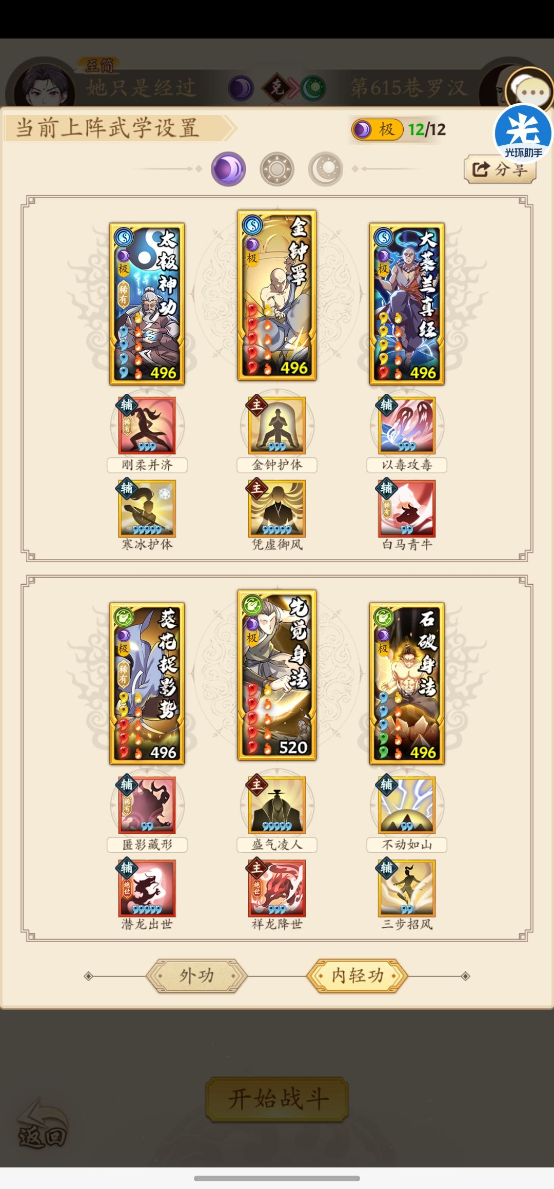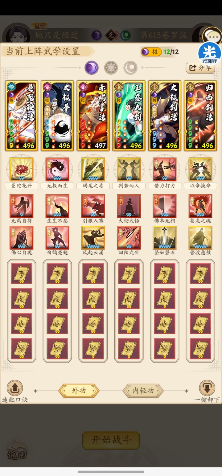 按照以往的三系塔套路来讲,一个套路当中总可以凑齐双太极无羁套,在前中期这样的配置确实可以实现实时爬塔,基本没有什么压力。但是在600层以后,木人基础属性大幅度强化,再加上对于套路内息12极的严苛要求,使得爬三系塔需要一些调整。