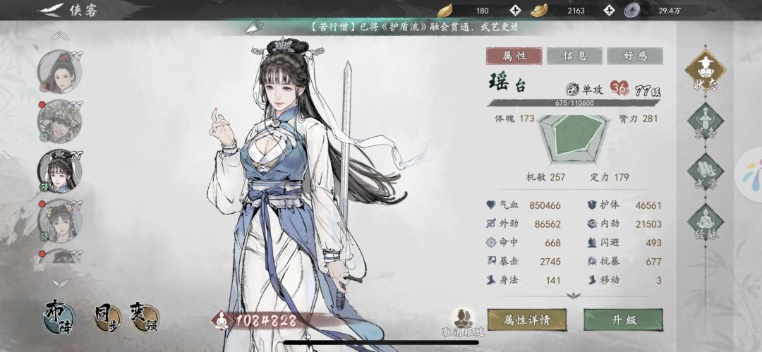 本打桩机也是看了其他帖子后结合了一点自己的想法 这个区是41区 神器棒子开的第一天 本号氪金800左右 甚至五色塔战令都没舍得买 战力500W 包里的功法书数量应该代表绝大部份小氪玩家 首先随从带凌霜这个可以直接Pass掉了 凌霜的技能全是蓝紫 本来人物和瑶台的蓝紫就不够升了 养不起来更别提去打伤害了 我的阵容就是小幅(扫提要7 泼墨5)芊芊(越女要紫5)等帕夏家传5重了再换 瑶台(实测很多次辣条的效果比与非要好,可以按我的那个技能顺序带)人物的话 技能就是带那些 我不带流云刺的原因就是我的瑶台带的是70散件 只吃2件套的杀破狼物攻百分之20加成 还有70暴击戒指 2700的暴击加宝物神器暴击率基本上可以是刀刀暴击 并不需要流云刺辅助也不需要带烽火套 既浪费了暴击率又浪费了一个输出格子技能(带捕风)2个暗器招式触发心法云水也够了 最后 瑶台家传很重要 优先拉满 拉满再考虑帕夏 一切的活动优先换信物