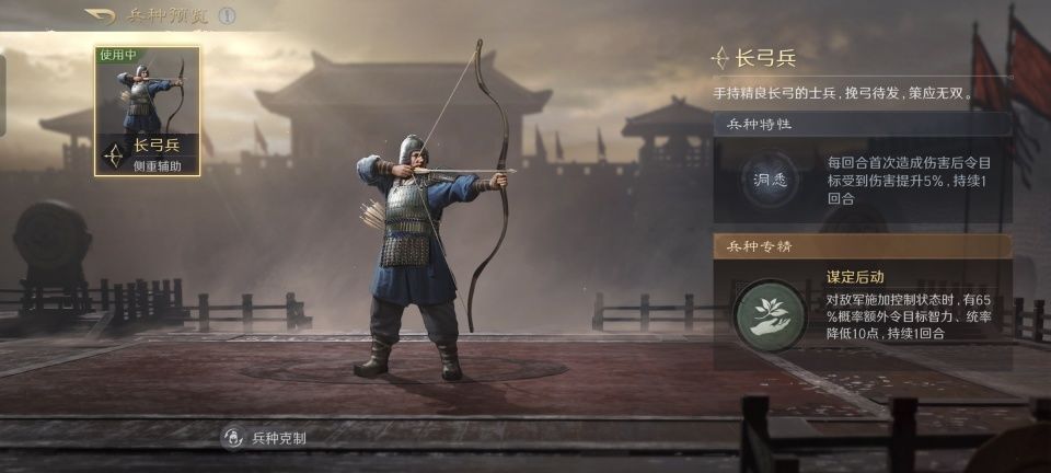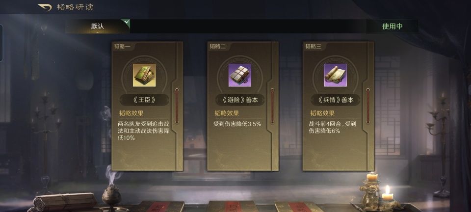鲁肃战法:划湘分荆+青囊急救+火羽。韬略库:治国论(专属)+受势善本+合谋善本。长弓兵特性洞悉,专精点亮谋定后动。相比起前两个橙色战法,鲁肃的第三战法火羽才是最关键的。这个紫色战法能够给敌方全体套火攻,他的先攻又比陆逊快,所以可以顺溜的触发焚烧。