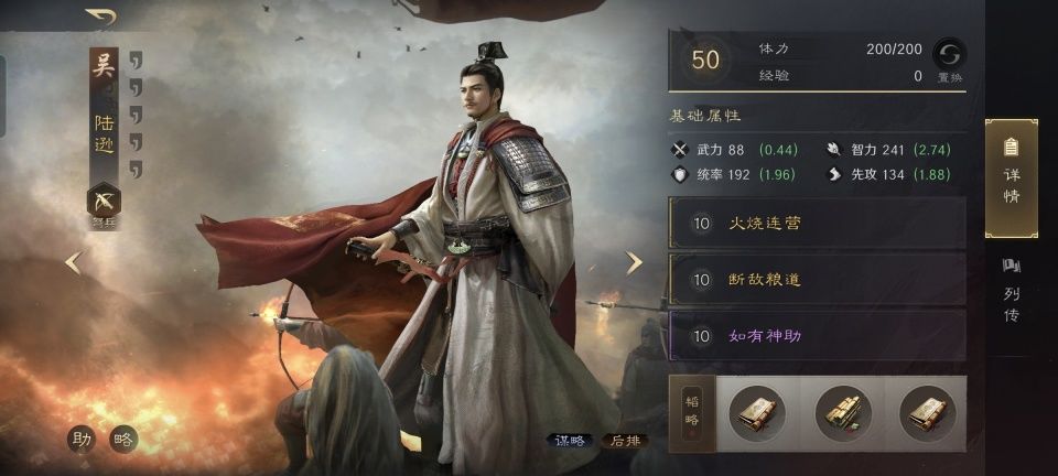 陆逊战法:火烧连营+断敌粮道+如有神助。韬略库:临时善本+焚营(专属)+谋令善本。弩兵特性劲弩,专精点亮釜底抽薪。受到如有神助的增益,火烧连营的发动率被提升到了68%,这支队伍的陆逊还兼顾了蛮横的断粮效果,能够大幅削弱对面敌人的医疗。