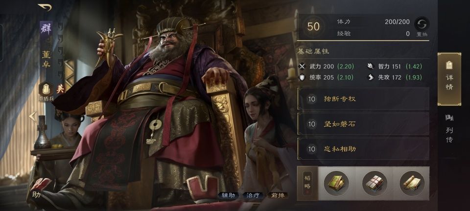 董卓战法:独断专权+坚如磐石+忘私相助。韬略库:王臣(专属)+避险善本+兵情善本。重盾兵特性不屈,专精点亮屹然不动。嘲讽敌军全体过来普攻自己,被打以后又能借助兵种的专精来回血,这确实相当耽误对面的都督队,而且儒将们的普攻对于话本版的董卓而言也是毫无威胁。