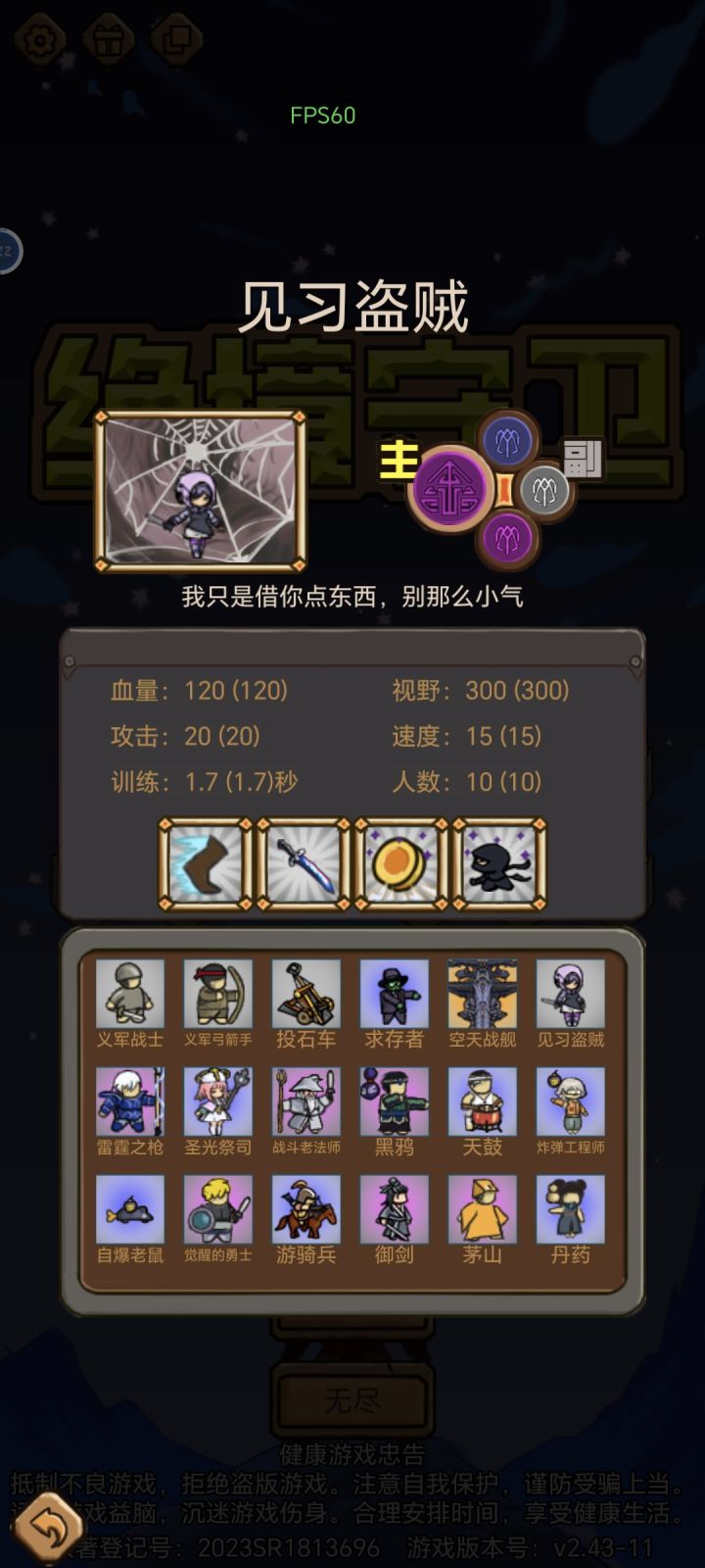 盗贼符文,一个三级攻击距离,一级、二级、三级双生各一个,这样总共10个本体,30个分身。因为本关怪物能力差,上阵其他英雄会抢人头,同时,主力输出少,分身能出手的次数更多,使金币偷取效率最大化。