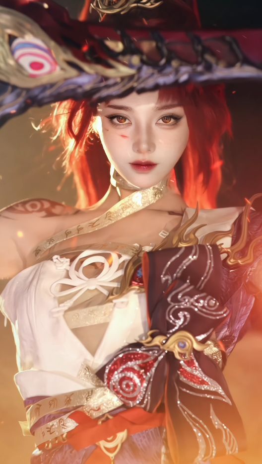 高挑飘逸的长发、绕身的红色缎带、腰间垂下的长带蝴蝶结,组成了周身飘逸灵动的线条元素,随着角色的行动发生形态的改变,翩跹飞舞。