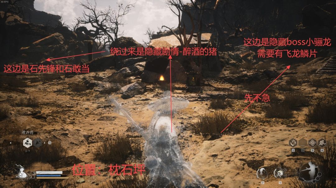 隐藏剧情+Boss:回枕石坪找猪→隐·斯哈里国→打“虎先锋”→沙漠边【打坐蒲团】→和敲鼓的黄鼠狼对话→打蝜蝂→得到【法宝】定风珠→进入枕石坪流沙瀑布,打小骊龙(隐藏boss)→回第一关“苍狼林-林外”,进入瀑布打赤髯龙(隐藏boss)。
