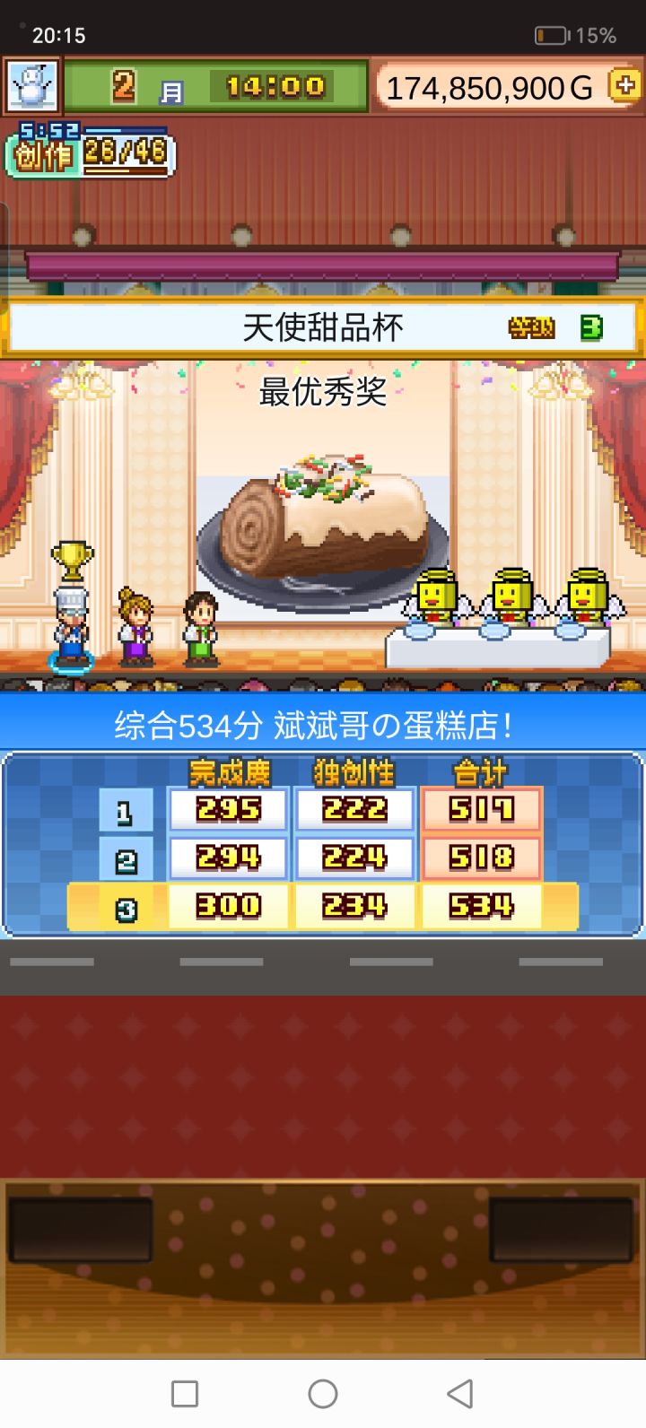 圣诞树蛋糕135级,抹巧93级,打泡鲜奶143级,巧克力喷剂10级(凑独创性的)。其实主要食材没必要这么高级,看独创性会发现,一项是90都能过。我调了一点抹巧的温度,加了独创性。