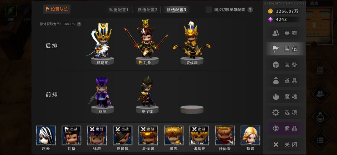 1、开荒阵容,诸葛亮,队长刘备,夏侯渊,徐庶,夏侯惇