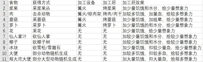 这些是梦境中最基础的食物是容易获得的(除超大坨大便外)。前期就依靠这些食物获得想象力,在这推荐一款前期在实用的食物那就是肉干(比较容易获得,不容易坏掉,可以回复少量血量,想象力给的也可以)
