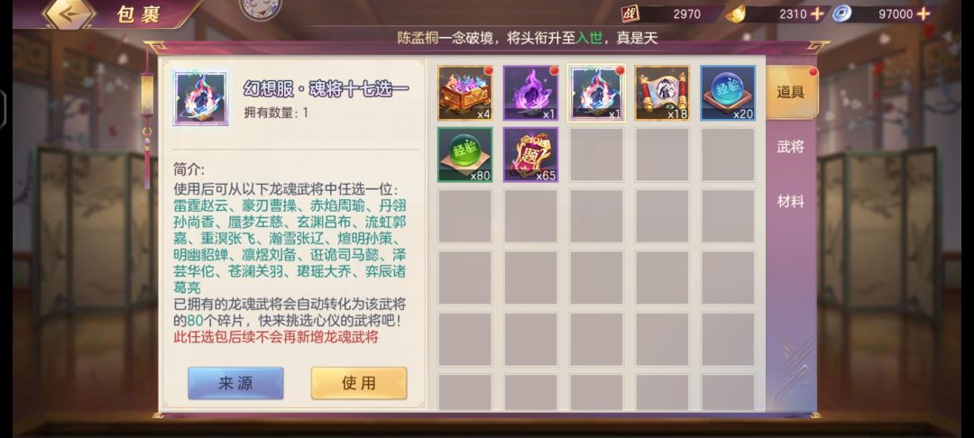 霹雳进宝活动:新区选择将魂或灵石炮弹,宝箱的奖励选择分为两种,长期游玩的选择中极陨铁、无双觉醒石或命魂石、3号宝箱灵幻命魂石、6号开始选择武将命魂信物;短期游玩体验建议3号宝箱选择无双将魂令、6号开始选择神将碎片、剩下选择无双觉醒石