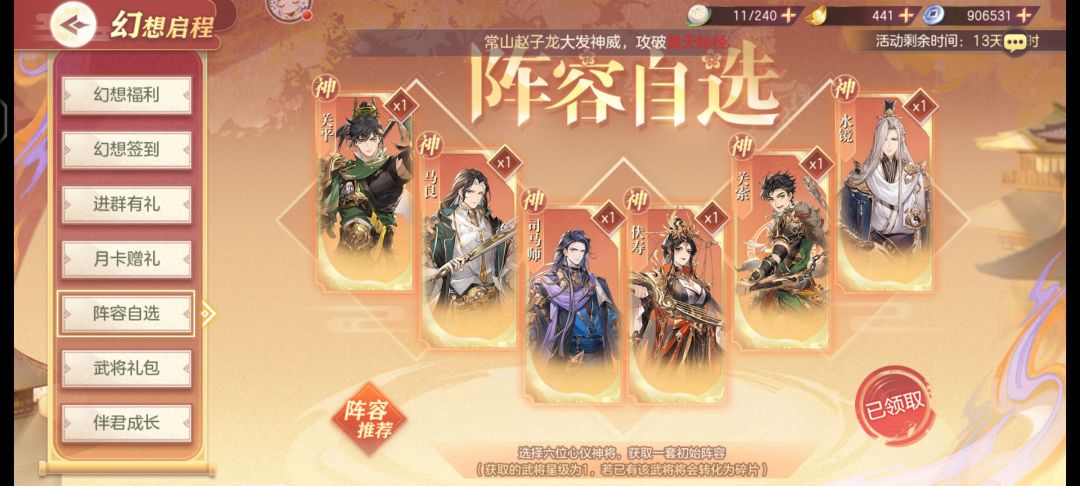 阵容选择:鲍三娘、关索、关平、水镜、司马师、伏寿、马良(平民建议主养水镜和司马师,有条件的玩鲍三娘和关索,后面pvp玩家可以去拉伏寿5星,配合奕辰诸葛亮伤害爆炸)