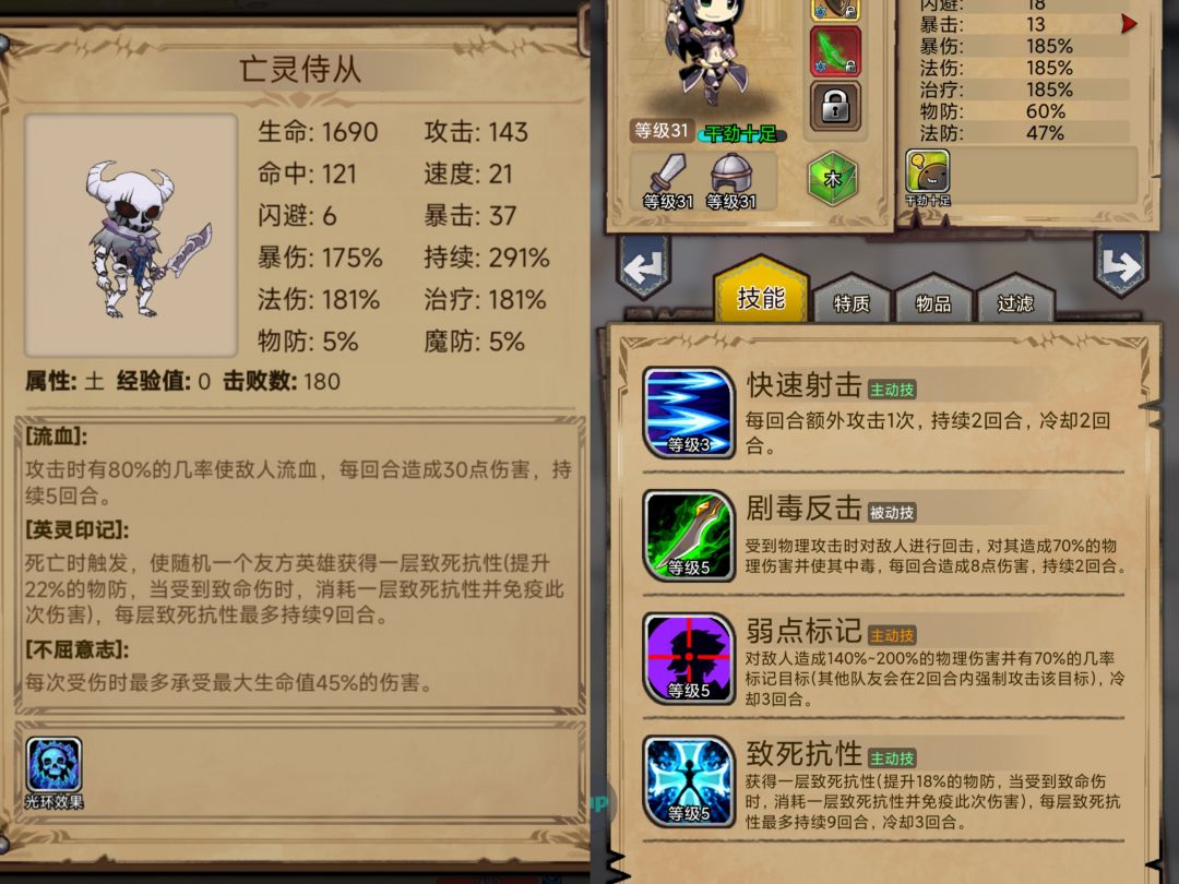 哎,小骷髅也有致死抵抗啊!而且还比弩手的牛逼(看图5,小骷髅的技能+22%物抗,弩手+18%)快速让小骷髅送死,暗法+灵媒快速召唤小骷髅,生时有buff,给对面叠debuff,死了还保护我,爱死你了,小骷髅!(看图4再回头看看图2,我基本60%~70%物抗,正式打起来的时候,有95%物抗,感恩小骷髅)
