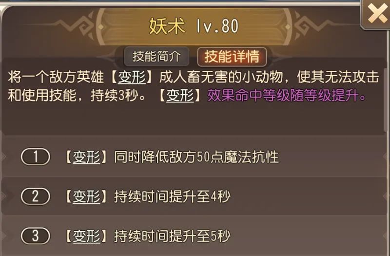 三技能——妖术,小Y的核心机制技能,开局释放技能。使敌方单体英雄稳定控制5S并降低魔抗,稳定点控技能。