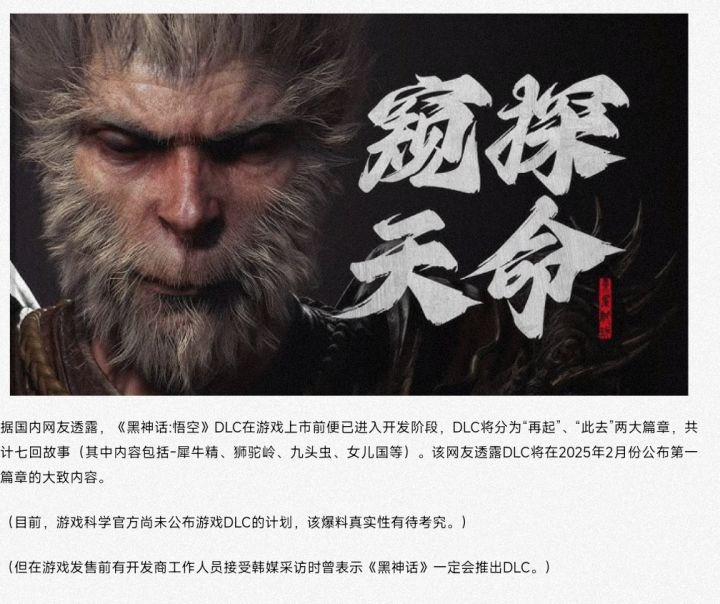 《黑神话 悟空》DLC内容预计2025年2月发售