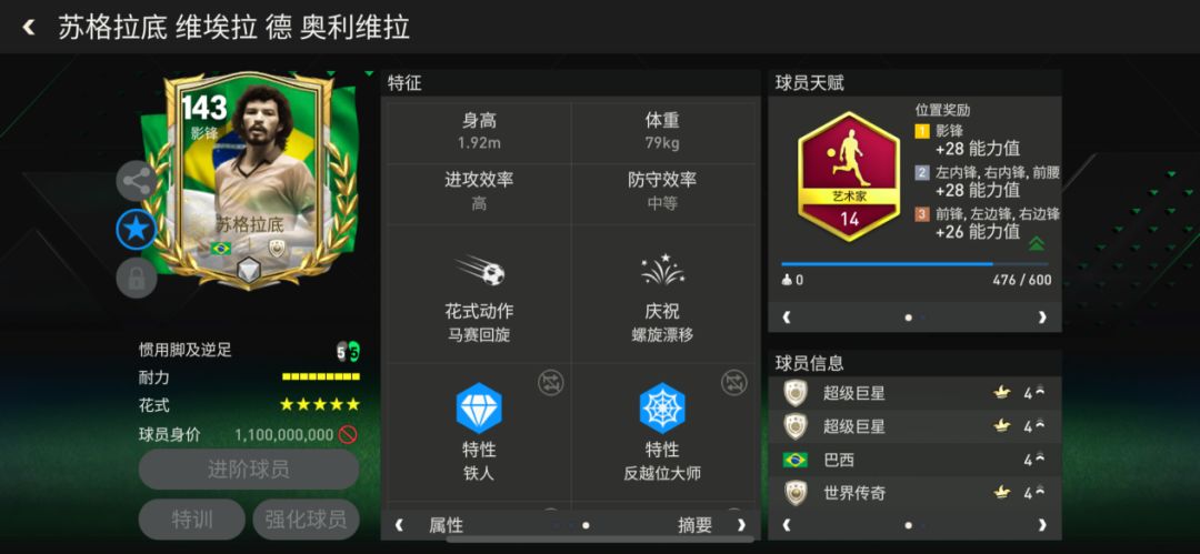 影锋或者前腰位置,推荐2024美洲杯巴西传奇143苏格拉底。推荐理由:一是苏格拉底虽然有着高大的模型,但是灵活性较为不错,在中前场有着不错的过人和摆脱能力。二是苏格拉底的身高优势,在争顶头球时有着不错的威胁。三是苏格拉底作为支点的效果不错,回撤接应后,经常能够给队友送上不错的直塞球。