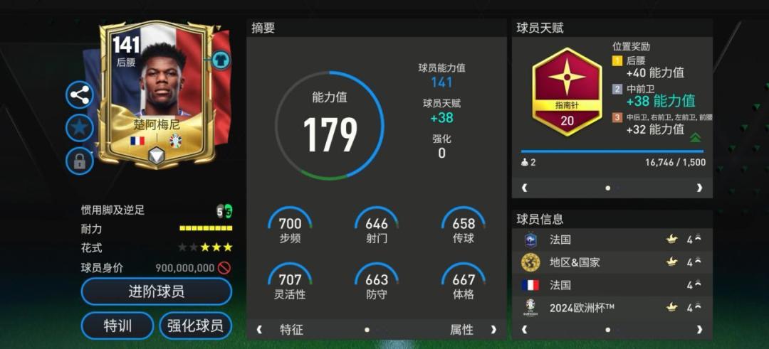 游戏中,楚阿梅尼在欧洲杯活动中推出了一张141的基础能力值的甄选球员卡,同样配备了指南针天赋,让他的中场表现更为全面。实战中,楚阿梅尼是一名中场存在感极强的防守球员。阵地防守中,楚阿梅尼的补防协防积极,他的防守范围非常大,能保持一整场在中场不断的跑动拦截。一对一防守时,楚阿梅尼的近身干扰以及断球时机把控也非常不错。在进攻端,楚阿梅尼盘带推进能力出色,虽然他的连续花式衔接速度不算快,但是单次花式的过人效率极高,另外在前插后,楚阿梅尼也能利用爆射制造威胁。