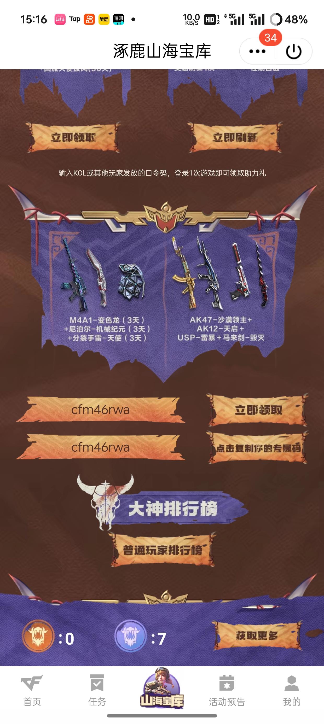 获取方式:1、微信搜索穿越火线手游助手,QQ搜索穿越火线。2、打开穿越火线手游助手,点击下方中间山海宝库。3、登录后点击大神排行榜,下拉页面。4、输入上方的神秘代码,领取奖励即可!
