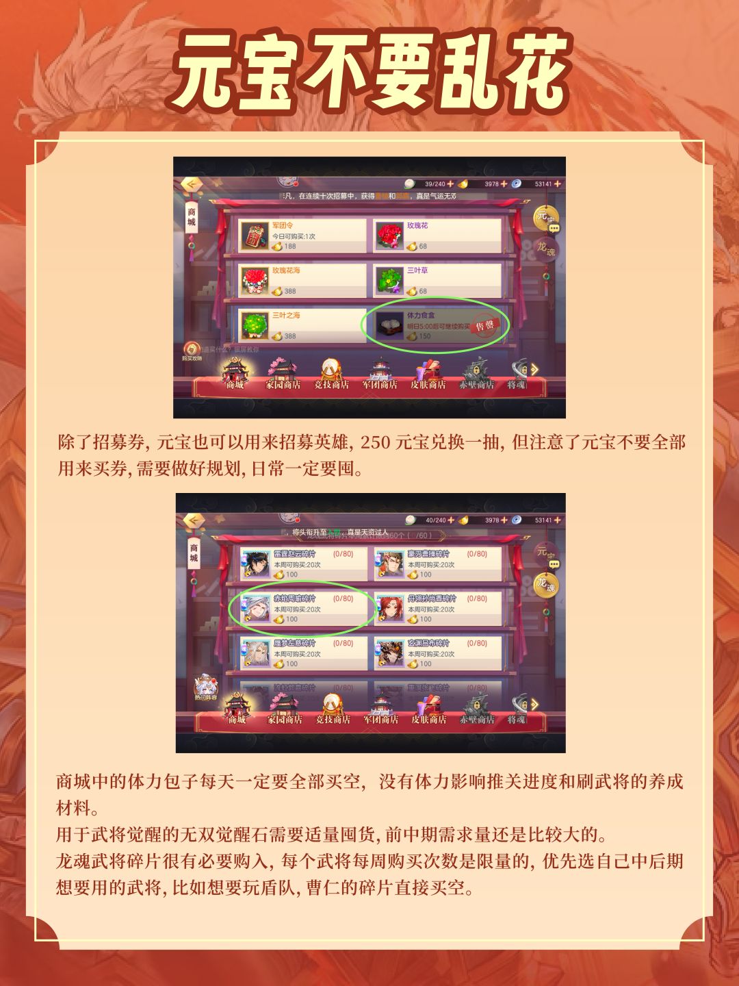除了招募券,元宝也可以用来招募英雄,250元宝兑换一抽,但注意了元宝不要全部用来买券,需要做好规划,日常一定要囤。商城中的体力包子每天一定要全部买空,没有体力影响推关进度和刷武将的养成材料。用于武将觉醒的无双觉醒石需要适量囤货,前中期需求量还是比较大的。龙魂武将碎片很有必要购入,每个武将每周购买次数是限量的,优先选自己中后期想要用的武将,比如想要玩盾队,曹仁的碎片直接买空。