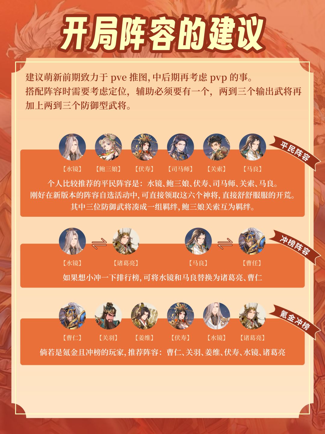 建议萌新前期致力于pve推图,中后期再考虑pvp的事。搭配阵容时需要考虑定位,辅助必须要有一个,两到三个输出武将再加上两到三个防御型武将。个人比较推荐的平民阵容是:水镜、鲍三娘、伏寿、司马师、关索、马良。刚好在新版本的阵容自选活动中,可直接领取这六个神将,直接舒舒服服的开荒。其中三位防御武将凑成一组羁绊,鲍三娘关索互为羁绊。如果想小冲一下排行榜,可将水镜和马良替换为诸葛亮、曹仁倘若是氪金且冲榜的玩家,推荐阵容:曹仁、关羽、姜维、伏寿、水镜、诸葛亮
