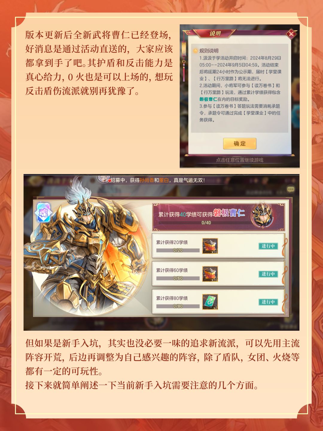 版本更新后全新武将曹仁已经登场,好消息是通过活动直送的,大家应该都拿到手了吧。其护盾和反击能力是真心给力,0火也是可以上场的,想玩反击盾伤流派就别再犹豫了。但如果是新手入坑,其实也没必要一味的追求新流派,可以先用主流阵容开荒,后边再调整为自己感兴趣的阵容,除了盾队,女团、火烧等都有一定的可玩性。接下来就简单阐述一下当前新手入坑需要注意的几个方面。