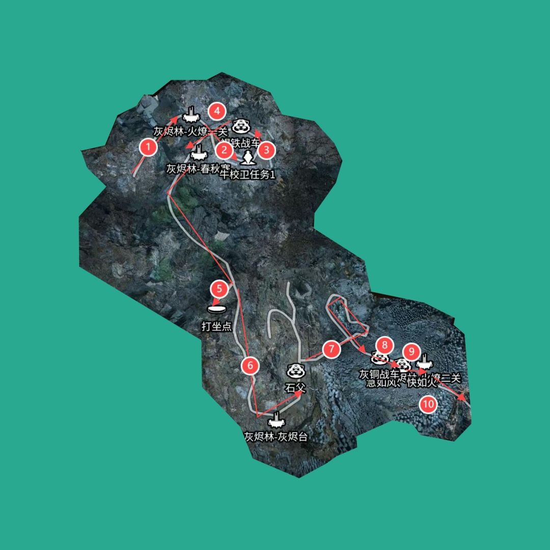 灰烬林① 【 火燎一关土地庙 】 →②打皓斧力士,然后对话→③打boss褐铁战车→④ 【 春秋寨土地庙 】 →过小木桥后,⑤右边山上【打坐蒲团】→⑥ 【 灰烬台土地庙 】 →打 boss 石父→⑦打 boss 灰铜战车→⑧打 boss 快如风、急如火→⑨ 【 火燎二关土地庙 】 →回 【 春秋寨 】 找皓斧力士→⑩【 火燎二关土地庙 】 →丹灶谷