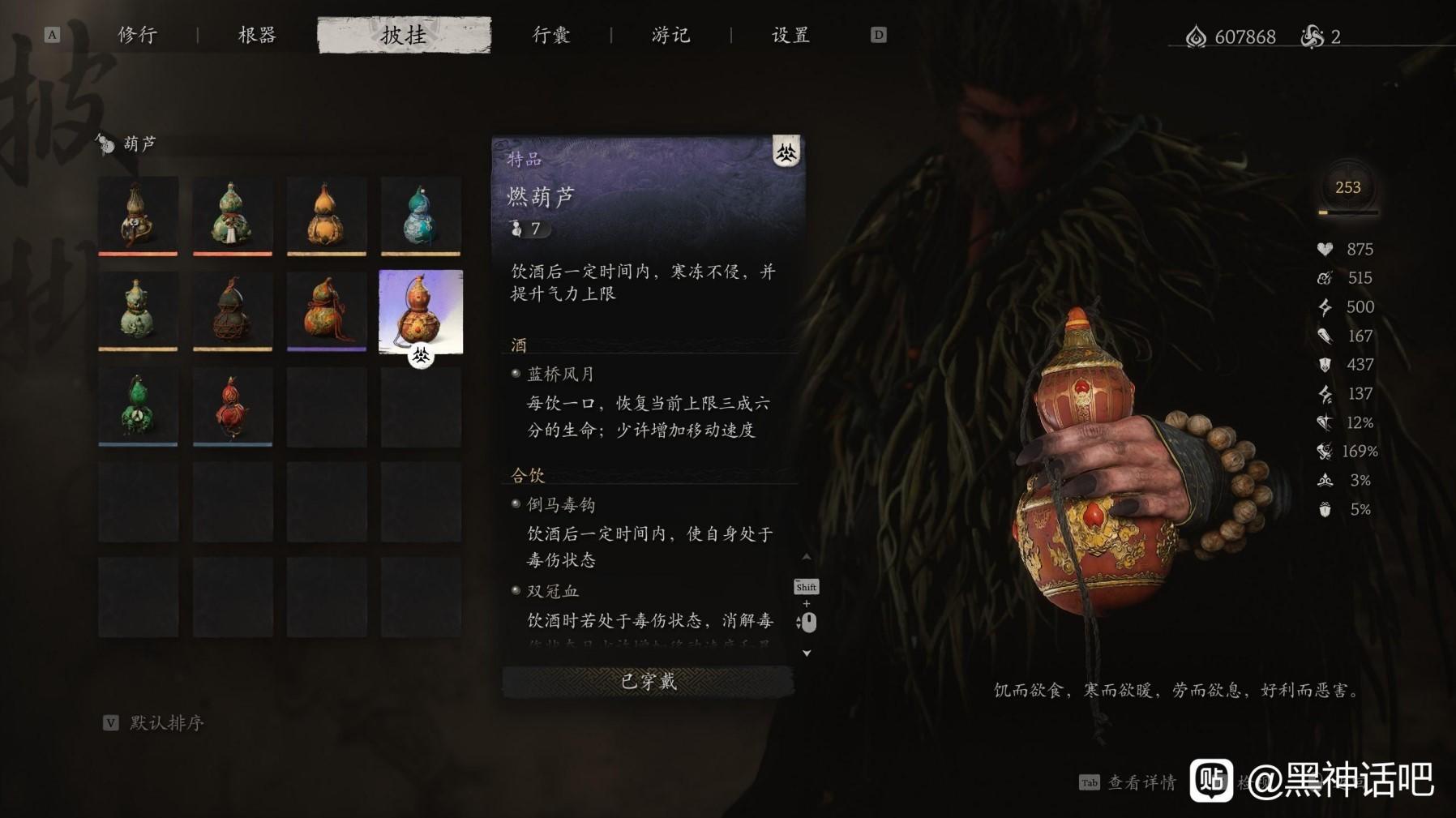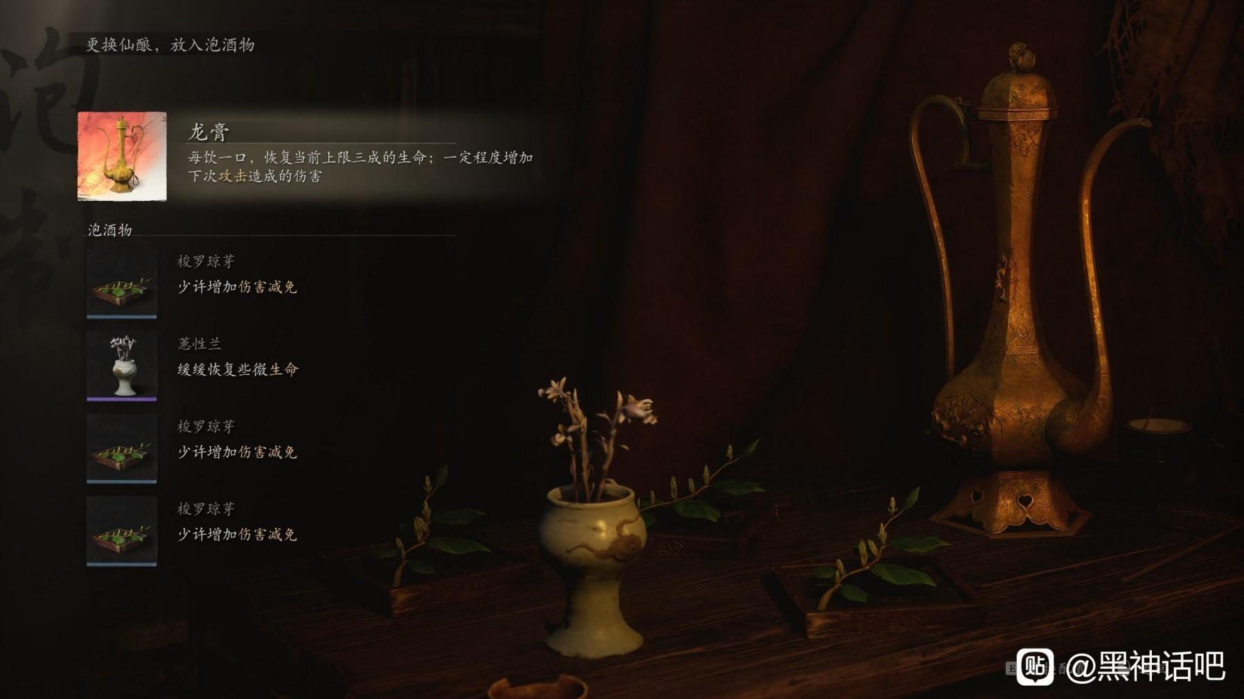 酒葫芦选择青田葫芦,泡酒物带梭罗琼芽(配合博山炉有很高减伤),彗性兰(缓慢回复)