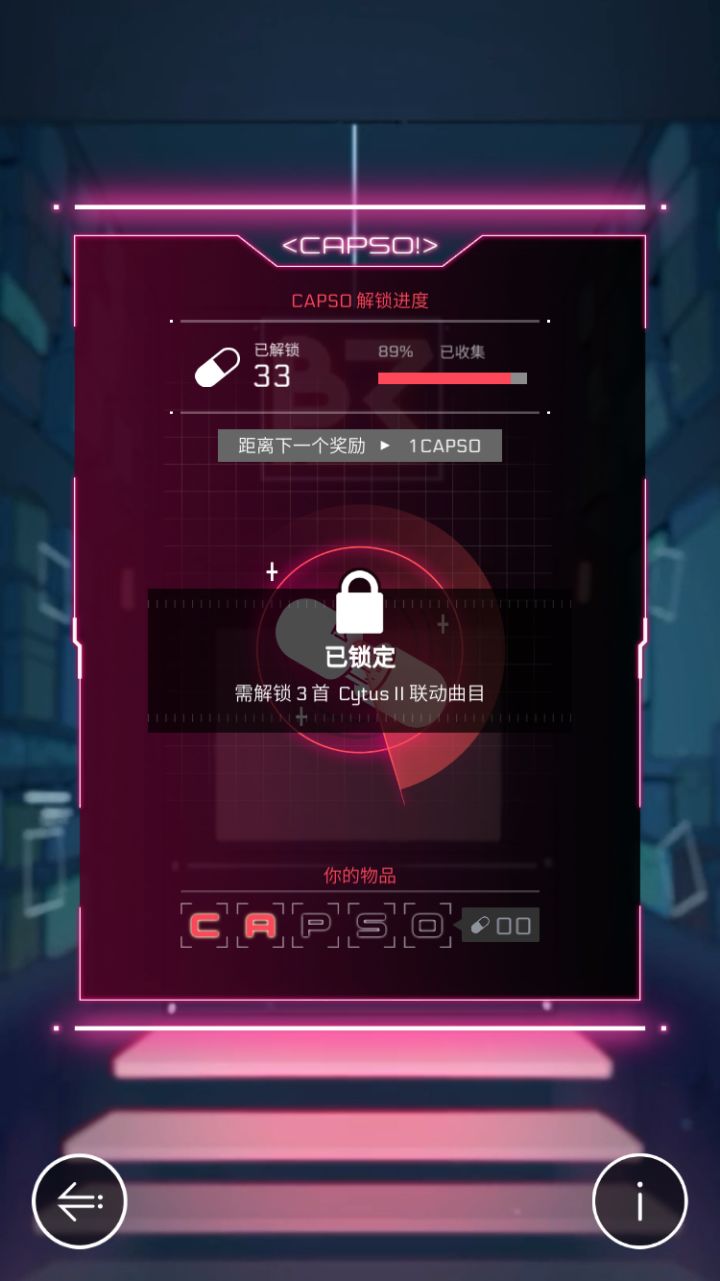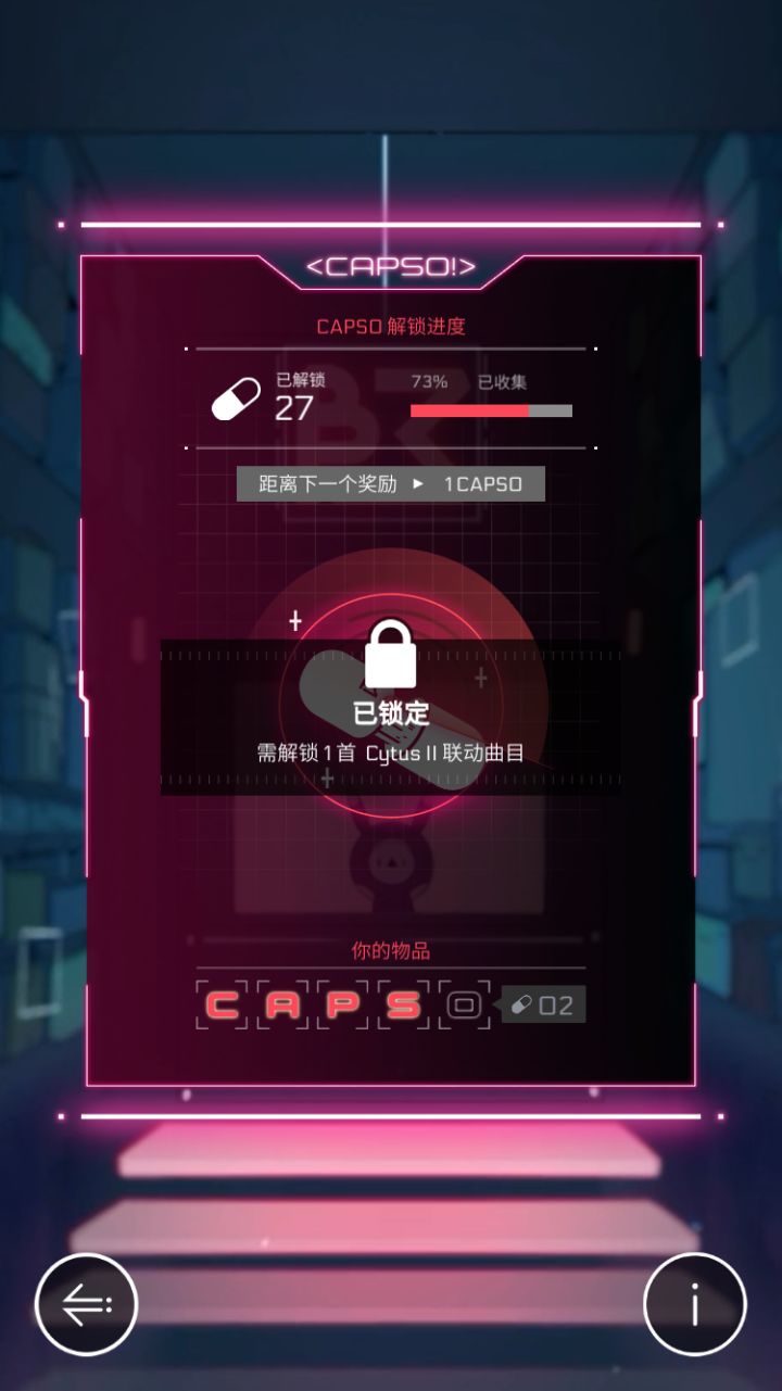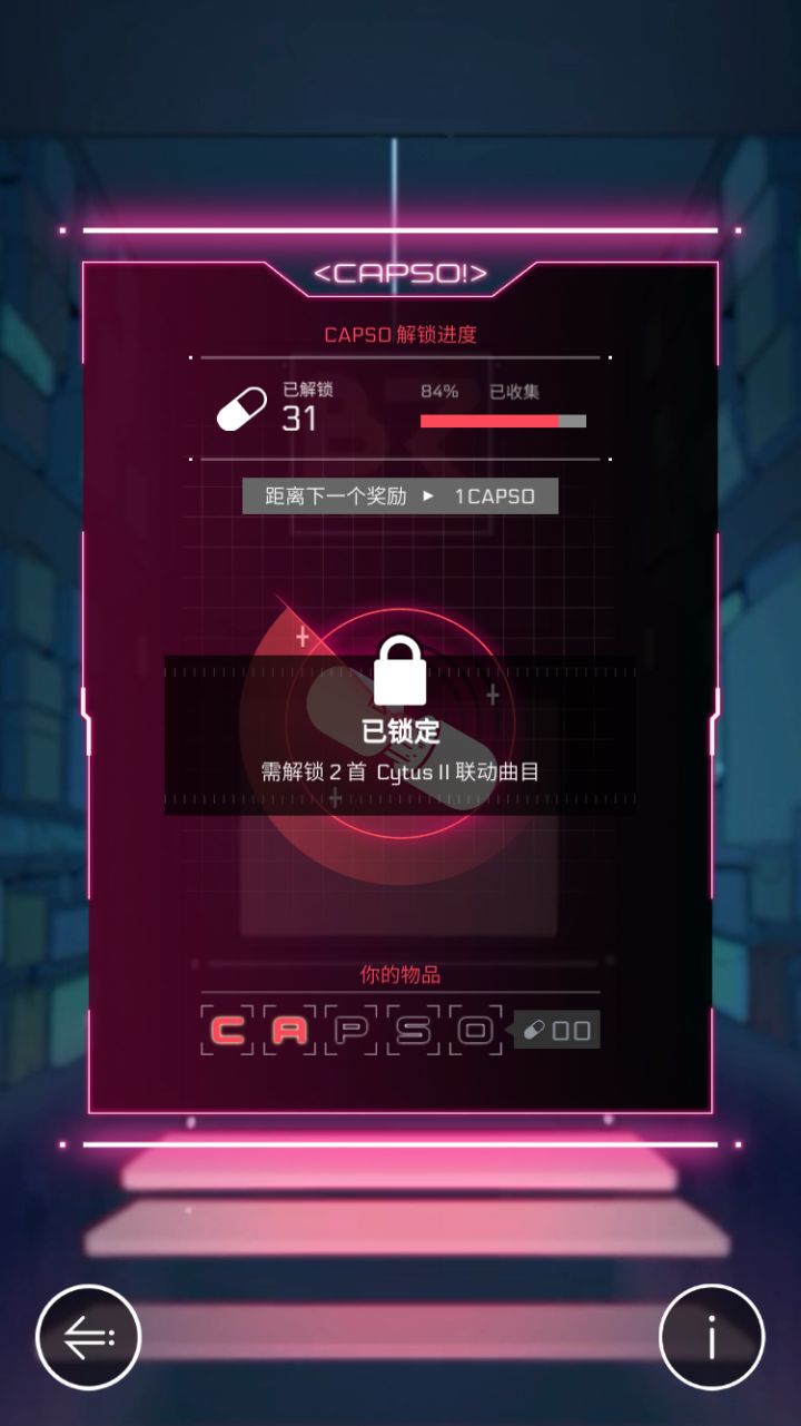 1.在解锁27次胶囊后便会锁定(如图一),要求解锁任意一首音乐世界联动曲(联动曲为 漂流、Hydra、Alexandrite ),之后获得仍可以获得“CAPSO”字母但无法继续解锁奖励