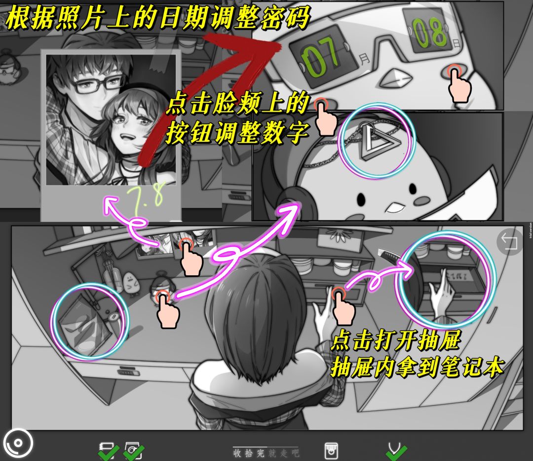 ②区域三:零食,笔记本(需要打开右侧抽屉),项链(需要根据书桌上方贴着的照片日期7.8,解锁小鸡玩具【0708】)