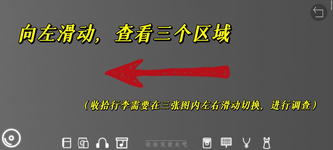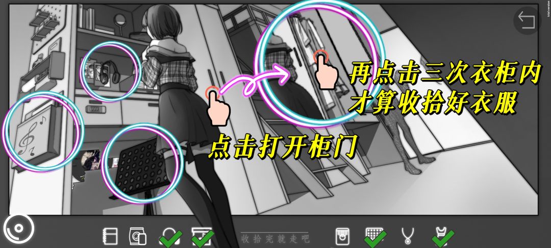 ①区域一:耳机,乐谱架,音乐盒(应该不叫音乐盒),衣服(需要点击打开衣柜,点击两次拿走衣服,再点击关上衣柜,共计点击4次才算收拾好)