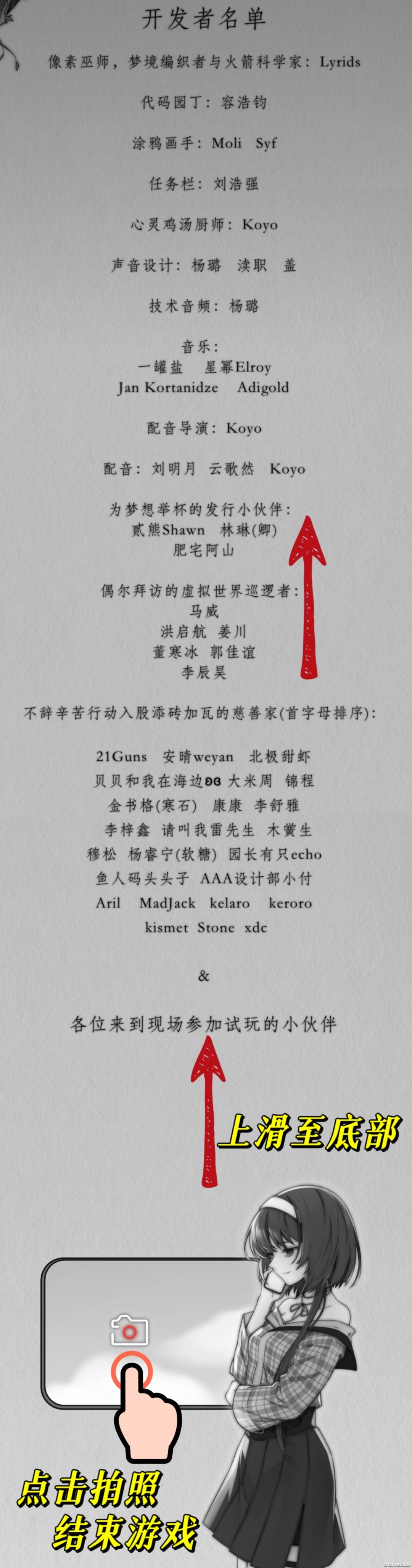 8.6 开发者名单处,向上滑动至底部,字幕结束后,点击拍照📸,结束游戏