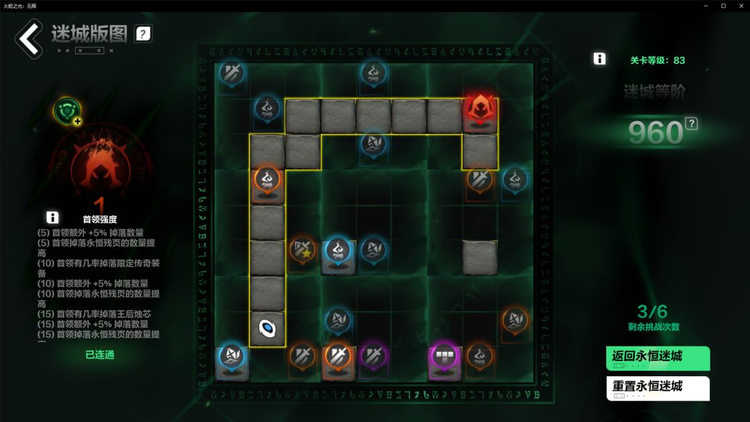 这是往前推,第三个赛季迷城赛季的赛季玩法(当时我还没入坑)玩家通过解锁永恒残垣(小迷城)组合成永恒迷城(大迷城),当天赋点满后,玩家需要解锁9个小迷城,才能进入大迷城(一开始是4个),在此,推荐现在想玩迷城的玩家,可以先在交易行购买永恒残页,先把所有天赋点满,再进行游玩,体验会好一点(左边的速度,右边的减伤,和下面的减血,以及迷城等阶可以先不点)