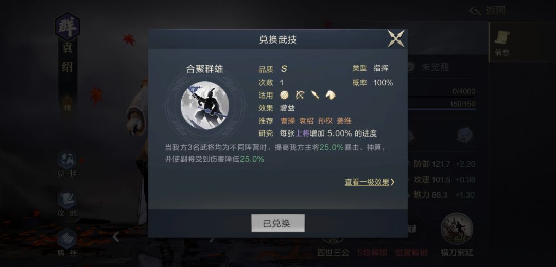 合聚群雄这个战法来自于袁绍的拆解技能,需要同时上阵3个不同阵营的武将才能激活,激活后副将减伤25%(武力智力都是减25%),主将暴击和神算加25%。