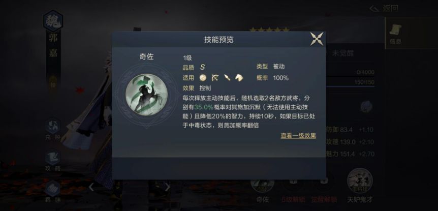 首先控制位郭嘉:在目标有中毒BUFF下沉默概率高达70%,因此配备计略百出,不仅补充毒BUFF还有属性伤害触发庞统连环,还有风罡状态提高陆逊技能判定概率,完美搭配!